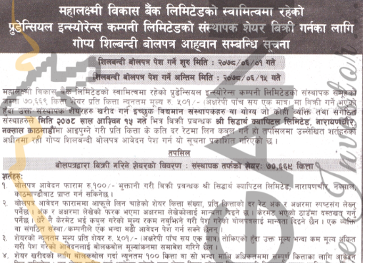 काठमाडौं । महालक्ष्मी विकास बैंकको स्वामित्वमा रहेको प्रुडेन्सियल इन्स्योरेन्सको संस्थापक समुहको ७० हजार ६६९ कित्ता शेयर लिलामीमा विक्री खुला हुने भएको छ । उक्त शेयर खरीद गर्न इच्छुक विद्यमान संस्थापक वा व्यक्ति, कम्पनी तथा संस्थाले कम्पनीले असोज १५ गतेसम्म बोलपत्र पेश गर्न सक्नेछन् ।