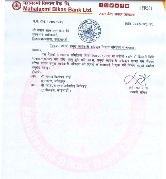 काठमाडौं । महालक्ष्मी विकास बैंकको कायम मुकायम प्रमुख कार्यकारी अधिकृतमा दिपेश लम्साल नियुक्त भएका छन् । बैंकको पुस २८ गते बसेको संचालक समितिको बैठकले माघ १ गतेदेखि लागु हुने गरि लम्साललाई कायम मुकायम प्रमुख कार्यकारी अधिकृतमा नियुक्त गर्ने निर्णय गरेको हो।