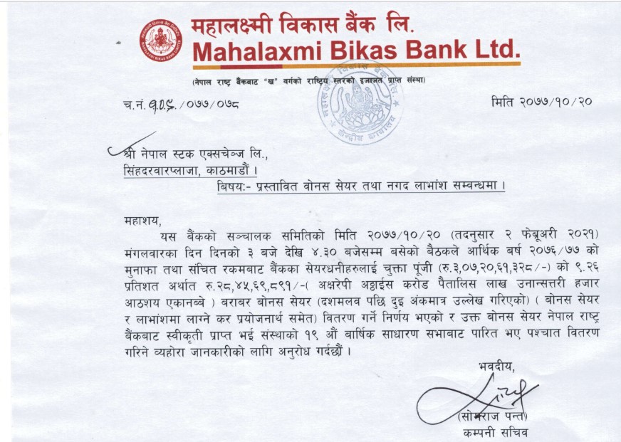 काठमाडौं । महालक्ष्मी विकास बैंकले गत आर्थिक वर्षको नाफाबाट शेयरधनीलाई वितरण गर्ने लाभांश प्रस्ताव गरेको छ । बैंक सञ्चालक समितिको माघ २० गते सम्पन्न बैठकले शेयरधनीलाई चुक्ता पूँजीको ९ दशमलव २६ प्रतिशत बोनस शेयर (बोनसमा लाग्ने कर प्रयोजन सहित) वितरण गर्ने प्रस्ताव गरेको हो ।