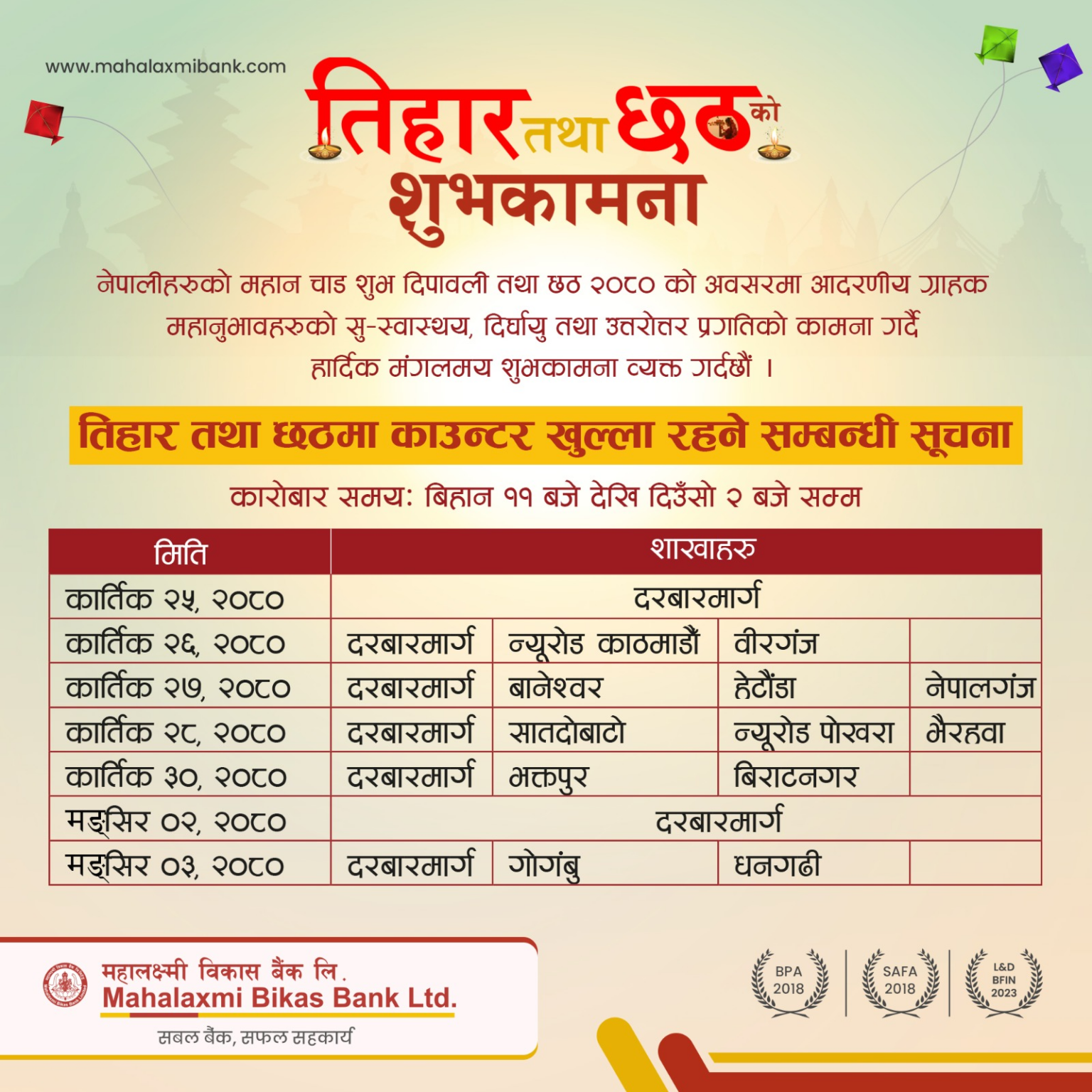 महालक्ष्मी विकास बैंकले तिहार तथा छठ बिदामा पनि बैंकिङ सेवा दिने