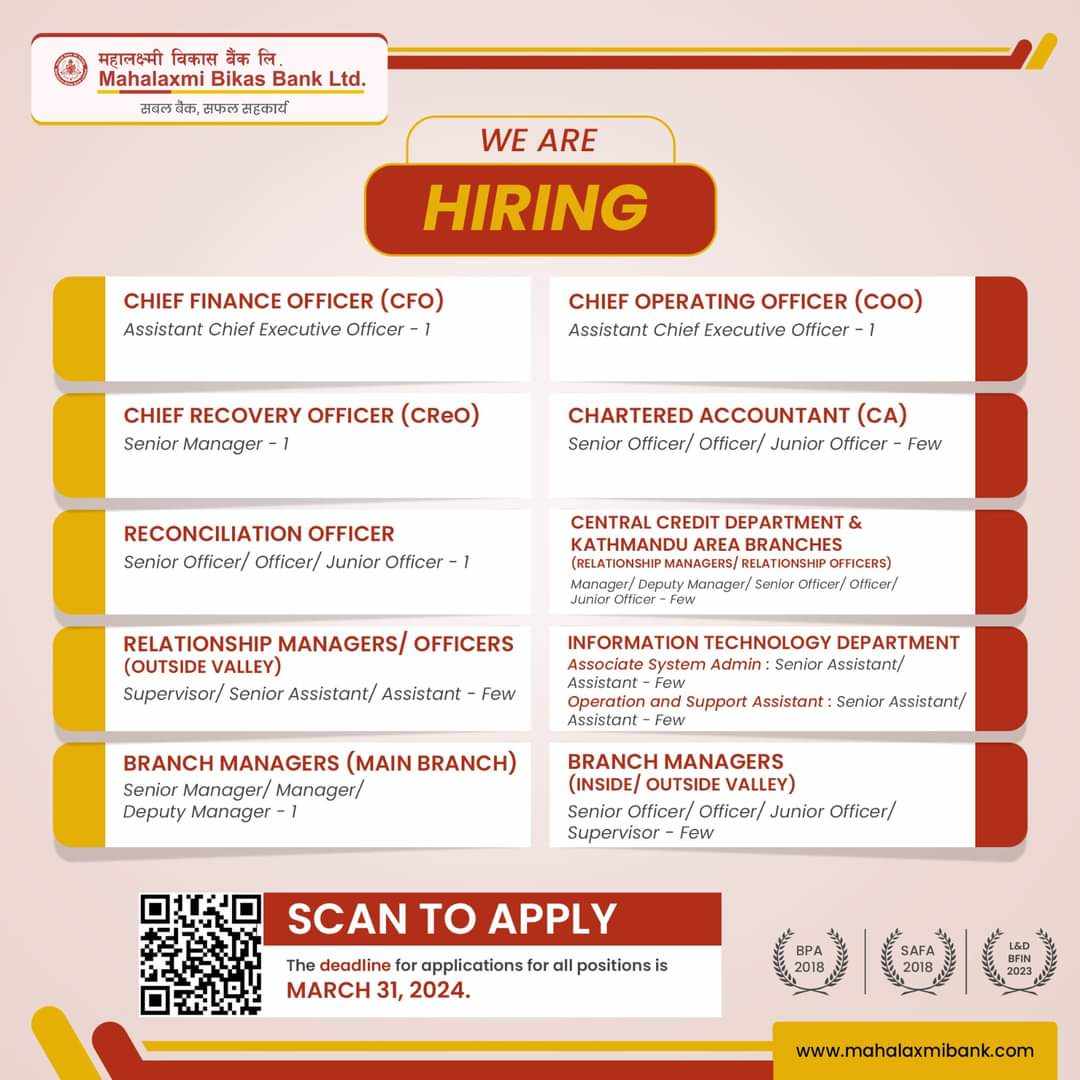 काठमाडौं । महालक्ष्मी विकास बैंकले विभिन्न पदहरुका लागि कर्मचारी माग गरेको छ । बैंकले चिफ फाइनान्स अफिसरका लागि, चिफ रिकभरि अफिसर, रिसकन्सीलेशन अफिसर, रिलेशनसिप म्यानेजर, ब्रान्च म्यानेजर, चिफ अपरेटिङ अफिसर, एकाउन्टेन्ट, सेन्ट्रल क्रेडिट डिपार्टमेन्ट, इन्फरमेशन टेक्नोलोजी डिपार्टमेन्टका लागि केही संख्यामा कर्मचारी माग गरेको हो । इच्छुक तथा योग्यता पुगेकाले चैत १८ गते भित्र कार्यालय समयमा आवेदन दिनुपर्नेछ ।