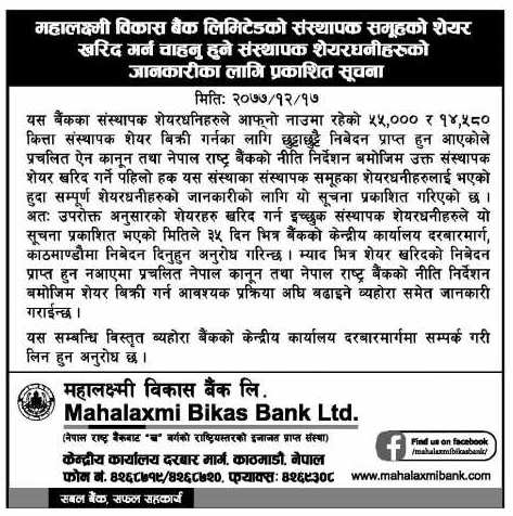 काठमाडौं । महालक्ष्मी विकास बैंक लिमिटेडले ६९ हजार ५ सय ८० कित्ता संस्थापक समूहको शेयर बिक्री गर्ने भएको छ । बैंकले एक सूचना जारी गर्दै यस्तो जनाएको छ ।