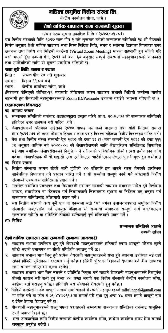 काठमाडौं । महिला लघुवित्त वित्तीय संस्था लिमिटेडले आज पुष २४ गते वार्षिक साधारण सभा आह्वान गरेको छ । संस्थाको पुष २ गते, बिहीबार बसेको सञ्चालक समितिको बैठकले गरेको निर्णय अनुसार संस्थाको उक्त सभाको मिति तय भएको हो ।