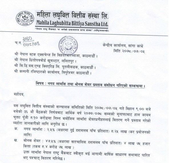 काठमाडौं । महिला लघुवित्तको लाभांश परिमार्जन भएको छ । कम्पनीले बोनश शेयर बढाएको छ । कम्पनीले यस अघि ४५ प्रतिशत बोनश र ५ प्रतिशत नगद गरि कुल ५० प्रतिशत लाभांश वितरण गर्ने प्रस्ताव गरेको थियो ।