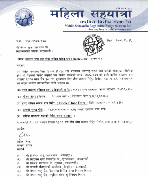 लाभांश प्रयोजनका लागि संस्थाले चैत्र १ गते आइतबार एक दिन बुक क्लोज गर्ने भएको छ । फागुन २७ गते विहीबार शिभरात्री गरेको हुनाले फागुन २६ गते बुधबारसम्म नेप्सेमा कारोबार भइ कायम शेयरधनीले मात्र सभामा भाग लिन तथा लाभांश पाउन योग्य हुनेछन् ।