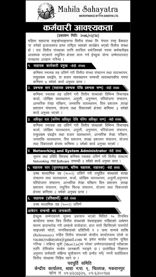 महिला सहयात्रा लघुवित्त वित्तीय स.सथाले विभिन्न् पदका लागि कर्मचारीको माग गरेको छ । लघुवित्तले सहायक प्रमुख कार्यकारी अधिकृतका लागि केही, सहायक प्रबन्धकदेखि प्रबन्धक स्तरसम्मको लागि केही, कनिष्ठ अधिकृतदेखि अधिकृतसम्मका लागि केही, नेटर्वकिङ एण्ठ सिस्टम एडमिनिस्टरका लाष् िकेही, सुपरभाइजर, वरिष्ठ सहायक तथा सहायकका लागि केही, प्रशिक्षर्थीका लागि केही कर्मचारीको माग गरेको छ ।