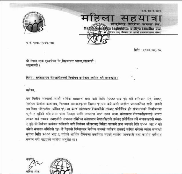 कोभिड १९ कारण साधारण सभामा निर्वाचनका लागि साधारण सभासम्म सर्वसाधारणको आवतजावत सम्भव नभएकाले निर्वाचन कार्यक्रम स्थगित भएको संस्थाले जनाएको छ।