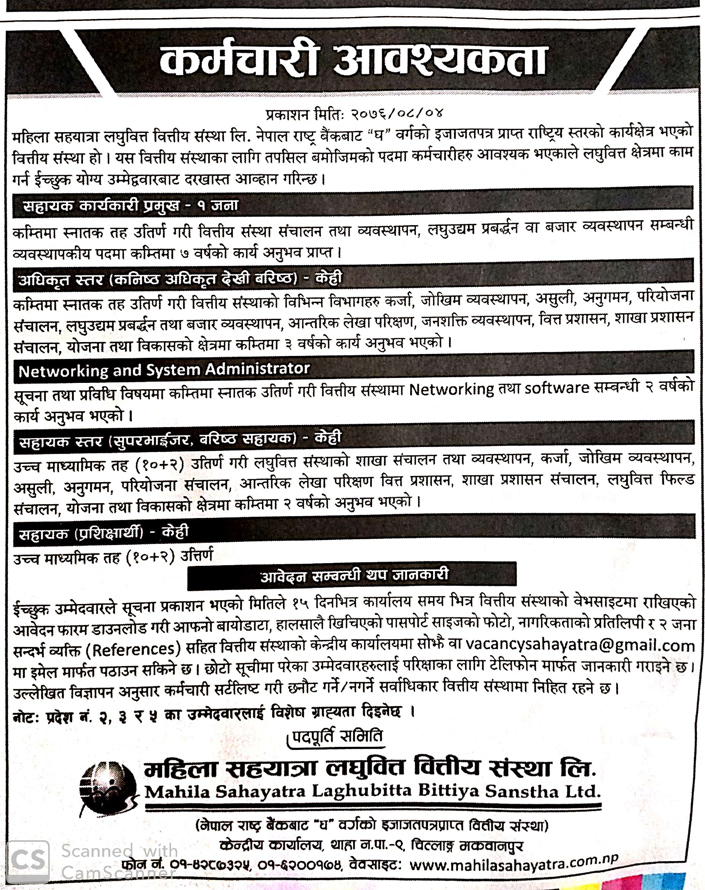 काठमाडौं । महिला सहयात्रा लघुवित्त वित्तयि संस्थाले विभिन्न पदका लागि कर्मचारीको माग गरेको छ । लघुवित्तले सहायक कर्मचारी प्रमुखको लागि १ जना, कनिष्ठ अधिकृतदेखि वरिष्ठसम्म केही, नेटवर्किङका लागि केही, सहायक सूपरभाइजरका लागि केही र सहायक प्रशिक्षर्थीका लागि केही संख्यामा कर्मचारीको माग गरेको हो ।