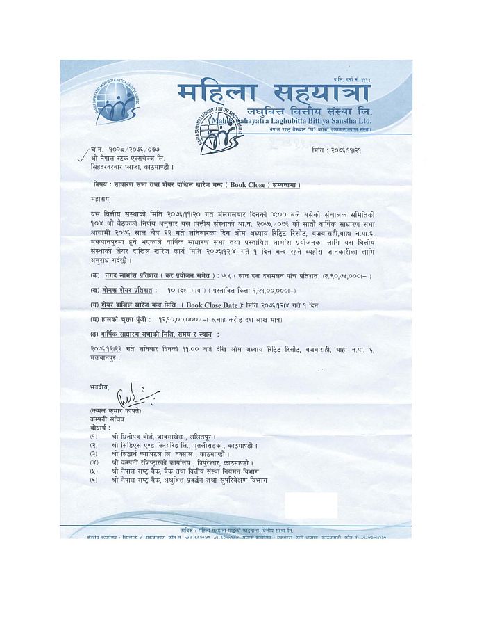 काठमाडौं । महिला सहयात्रा लेघुवित्तको वार्षिक साधारण सभा चैत २२ गते हुने भएको छ । सभा ओम अध्याय रिट्रिट रिसोर्ट बज्रबाराही, मकवानपुरमा हुने संस्थाले जनाएको छ । कम्पनीको फागुन २० गते बसेको सञ्चालक समितिको बैठकले साधारण सभा गर्ने निर्णय गरेको हो ।
