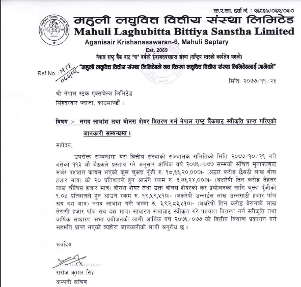 काठमाडौं । महुली लघुवित्तको लाभांश स्वीकृत भएको छ । नेपाल राष्ट्र बैंकले संस्थाको माघ २९ गते बसेको संचालक समितिको बैठकले आर्थिक वर्ष ७६/७७ को मुनाफाबाट हाल कायम चुक्ता पुँजीको २० प्रतिशतल हुन आउने ३ करोड ७३ लाख २४ हजार बराबरको बोनश शेयर र १ दशमलव ०५ प्रतिशतले हुन आउने १९ लाख ५९ हजार ५ सय १० रुपैयाँ बराबरको नगद लाभांश गरि कुल २१ दशमलव ०५ प्रतिशत लाभांश वितरण गर्ने प्रस्ताव गरेको थियो ।सोहि प्रस्ताव नेपाल राष्ट्र बैंकले स्वीकृत गरेको हो ।