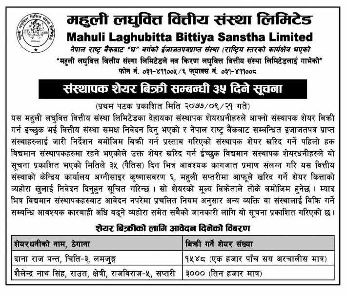 काठमाडौँ । महुली लघुवित्त वित्तीय संस्था लिमिटेडले ४ हजार ५ सय ४८ कित्ता संस्थापक शेयर बिक्री गर्ने भएको छ । संस्थाले एक सूचना प्रकाशन गर्दै यस्तो जनाएको छ ।