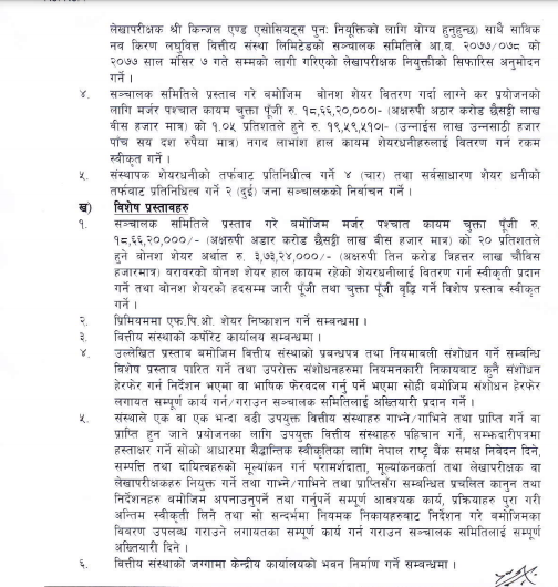 त्यस्तै, कम्पनीको प्रबन्धपत्र र नियमावली आवश्यक संशोधन गर्ने, नियामक निकायबाट कुनै फेरबदल गर्न निर्देशन भएमा सोहि अनुसार गर्ने अख्तियारी संचालक समितिलाई दिने, गाभ्ने वा गाभिने सम्बन्धी अख्तियारी संचालक समितिलाई दिने लगायतका प्रस्तावहरु सभामा पेश हुनेछ ।