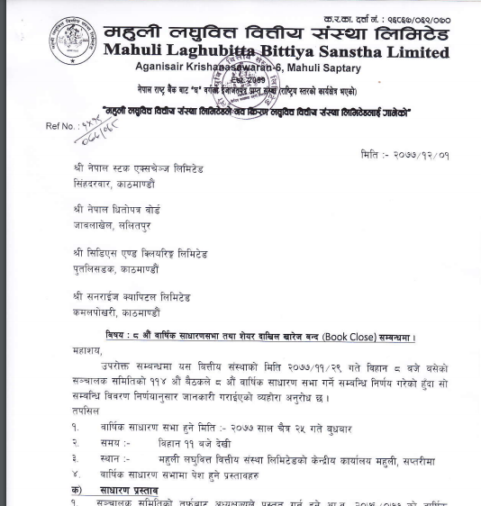 काठमाडौं । महुली लघुवित्तको वार्षिक साधारण सभा चैत २५ गते हुने भएको छ । संस्थाले सभामा प्रिमियममा एफपिओ निष्काशन गर्ने विशेष प्रस्ताव पारित गर्ने निर्णय गरेको छ । कम्पनीको फागुन २९ गते बसेको संचालक समितिको बैठकले साधारणसभा मिति तय गरेको हो । उक्त सभा सप्तरी स्थित आफ्नै केन्द्रीय कार्यालयमा गर्ने जनाएको छ ।