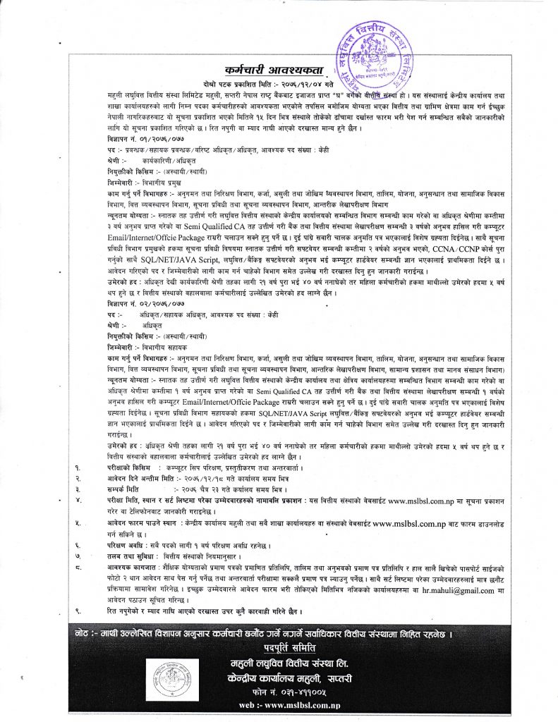 महुली लघुवित्त वित्तीय संस्थाले विभिन्न पदका लागि कर्मचारीको माग गरेको छ । लघुवित्तले प्रबन्धक, सहायक प्रबन्धक, वरिष्ठ अधिकृत र अधिकृत, सहायक अधिकृत पदका लागि केही मात्रममा कर्मचारी माग गरेको हो ।