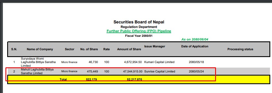 काठमाडौं । महुली लघुवित्त वित्तीय संस्था लिमिटेडले एफपीओ निष्काशन गर्नका लागि नियामक निकाय नेपाल धितोपत्र बोर्डमा निवेदन दिएको छ । कम्पनीले ४ करोड ७५ लाख ४४ हजार ९१५ बराबरको एफपीओ निष्काशन गर्न सेबोनमा भदौ २४ गते निवेदन दिएको हो ।