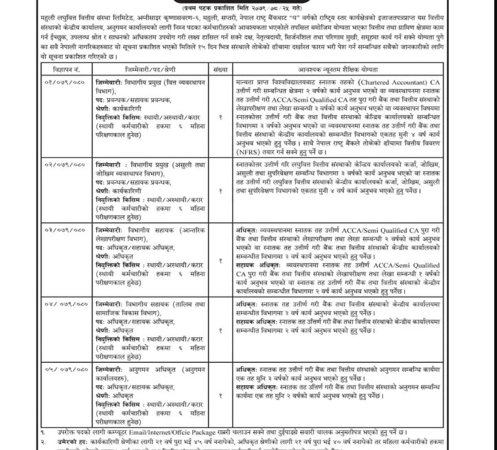 काठमाडौं । महुली लघुवित्त वित्तीय संस्था लिमिटेडले विभिन्न पदका लागि कर्मचारीको माग गरेको छ । संस्थाले विभागीय प्रमुखमा वित्त व्यवस्थापन विभाग अन्तर्गत प्रवन्धक र सहायक प्रबन्धक पदमा १ जना, विभागिय प्रमुख पदमा असुली तथा जोखि ब्यवस्थापन विभागका लागि १ जना, विभागीय सहायक पदमा आन्तरिक लेखापरीक्षण विभागमा १ जना, विभागीय सहायकमा तालिम तथा सामाजिक विकास विभागका लागि १ जना र अनुगमन अधिकृतमा १ जनाको लागि कर्मचारीको माग गरेको हो ।