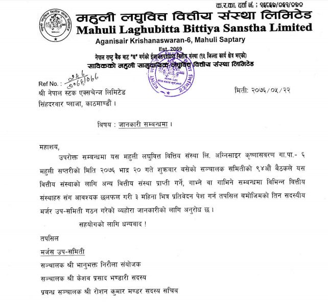 भदौ २० गते बसेको सञ्चालक समितिको बैठकले उपयुक्त वित्तीय संस्थासँग गाभ्ने वा गाभिने प्रयोजनका लागि उप समिति गठन गरेको हो । उप समितिलाई प्राप्ति गर्ने वा गाभिने सम्बन्धमा अन्य वित्तीय संस्थाहरुसँग छलफल गरी ३ महिनाभित्र प्रतिवेदन पेश गर्न सुचना मार्फत नै भनिएको छ ।