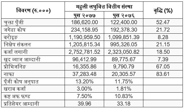 चुक्ता पुँजी १८ करोड ७७ लाख रुपैयाँ रहेको छ। जगेडा कोषमा २३ करोड ४१ लाख रुपैयाँ जम्मा गर्न सफल भएको छ। कोभिड १९ का कारण संस्थाको खराब कर्जा बढेको छ। दोस्रो त्रैमाशिक अवधिमा खराव कर्जा तीन प्रतिशत पुगेको छ। खराव कर्जा बढे सँगै एक करोड ६३ लाख रुपैयाँको प्रोभिजनिङ गरेको छ। प्रतिशेयर आम्दानी ३९ रुपैयाँ छ।