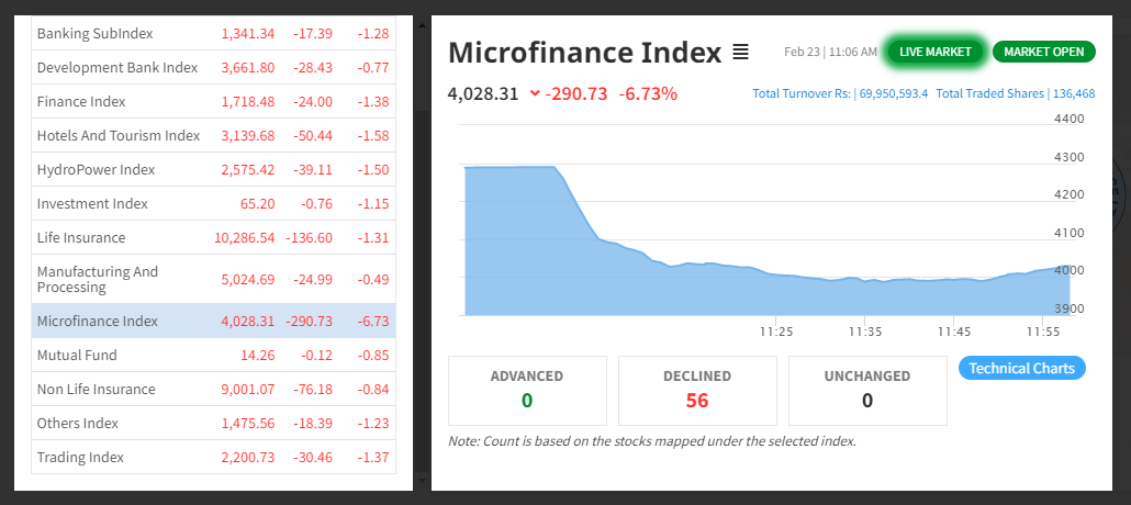 आज कारोबार भएका ५६ वटै लघुवित्तको शेयर मूल्य घटेका छन् । लघुवित्तको सूचक २९० अंकले घटेर ४०२८ अंक कायम भएको छ । नेपाल राष्ट्र बैंकले हिजो बुधबार एकिकृत निर्देशन जारी गर्दै लघुवित्त वित्तीय संस्थालाई १५ प्रतिशत भन्दा बढि लाभांश दिन नपाउने व्यवस्था गरिदिएको छ ।