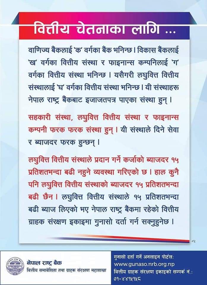 माइक्रोफाइनान्सलाई कर्जाको व्याजदरमा सिलिङ तोक्न सक्ने नेपाल राष्ट्र बैंकले किन बाणिज्य बैंक तथा अन्य बैंकहरुलाई चाही तोक्न सक्दैन भन्ने प्रश्नमा नेपाल राष्ट्र बैंकका सहायक प्रवक्ता नारायण प्रसाद पोखेरलले जवाफ दिए “मिल्दैन” ।