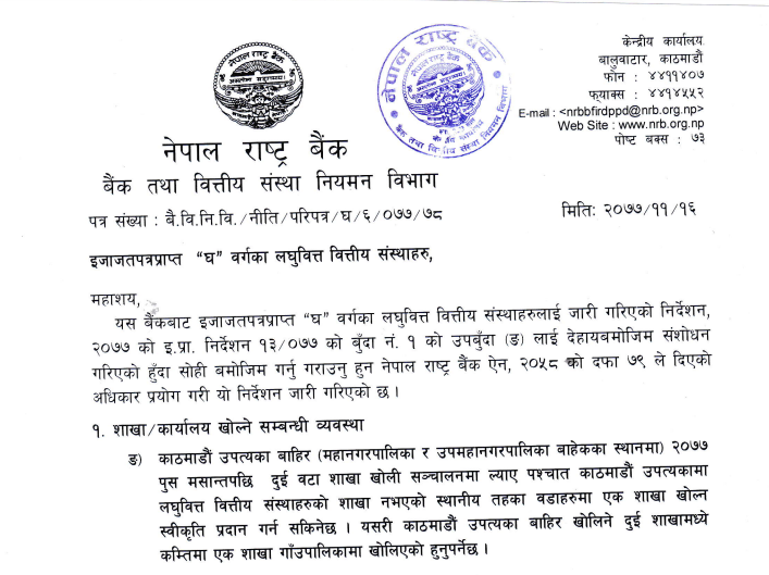 राष्ट्र बैंकले ‘घ’ वर्गका लघुवित्त वित्तीय संस्थाहरुलाई जारी गरिएको निर्देशनको निर्देशन १३/०७७ को बुँदा नम्बर एक को उपबँदा (ङ) लाई संशोधन गर्दै यस्तो व्यवस्था थप गरेको हो। राष्ट्र बैंकले मर्जमा गएका संस्थाहरुलाई भने काठमाडौं उपत्यका भित्र केन्द्रिय कार्यालय खोल्ने सुविधा प्रदान गर्दै आएको छ।