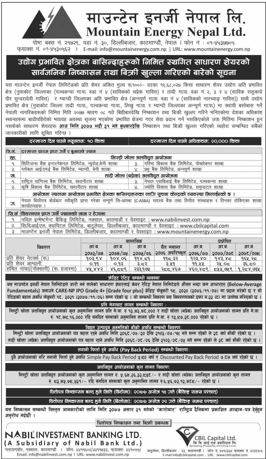 काठमाडौं । माउन्टेन इनर्जी नेपाल लिमिटेडले भाद्र ३१ गतेबाट आयोजना प्रभावित क्षेत्रका स्थानिय बासिन्दाहरुका लागि निष्काशन तथा बिक्री खुल्ला गरेको साधारण शेयर (आइपिओ) मा आवेदन दिने आज अन्तिम दिन रहेको छ ।