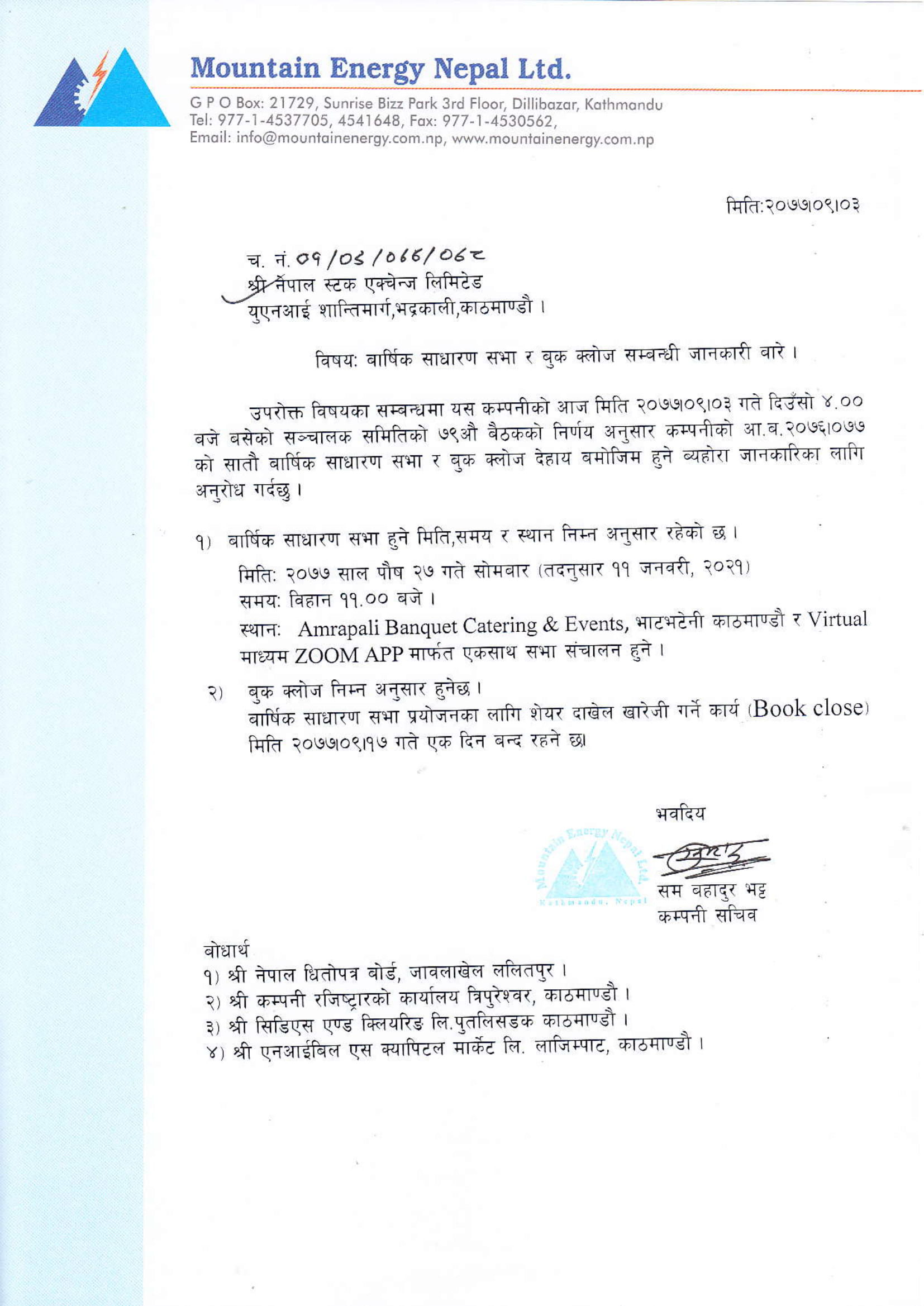 उक्त सभा पुस २७ गते सोमबार आम्रपाली ब्याङ्क्वेट, भाटभटेनी, काठमाडौंमा बिहान ११ बजेबाट भर्चुअल माध्यममार्फत सञ्चालन हुने कम्पनीले जनाएको छ ।