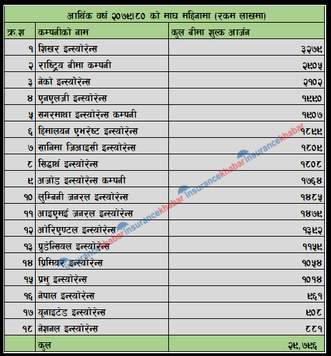 यस अवधिसम्ममा सबैभन्दा धेरै शिखर इन्स्योरेन्स कम्पनीले नै कुल बीमा शुल्क आर्जन गरेको छ । यस अवधिमा कम्पनीले ३२ करोड ७९ लाख रुपैयाँ कुल बीमा शुल्क आर्जन गरेको हो । दोस्रोमा राष्ट्रिय बीमा कम्पनी रहेको छ । कम्पनीले यस अवधिमा २९ करोड ५ लाख रुपैयाँ ब्यापार गरेको छ । नेको इन्स्योरेन्स कम्पनीले माघ महिनामा मात्रै २१ करोड २ लाख रुपैयाँ कुल बीमा शुल्क आर्जन गरेको छ ।