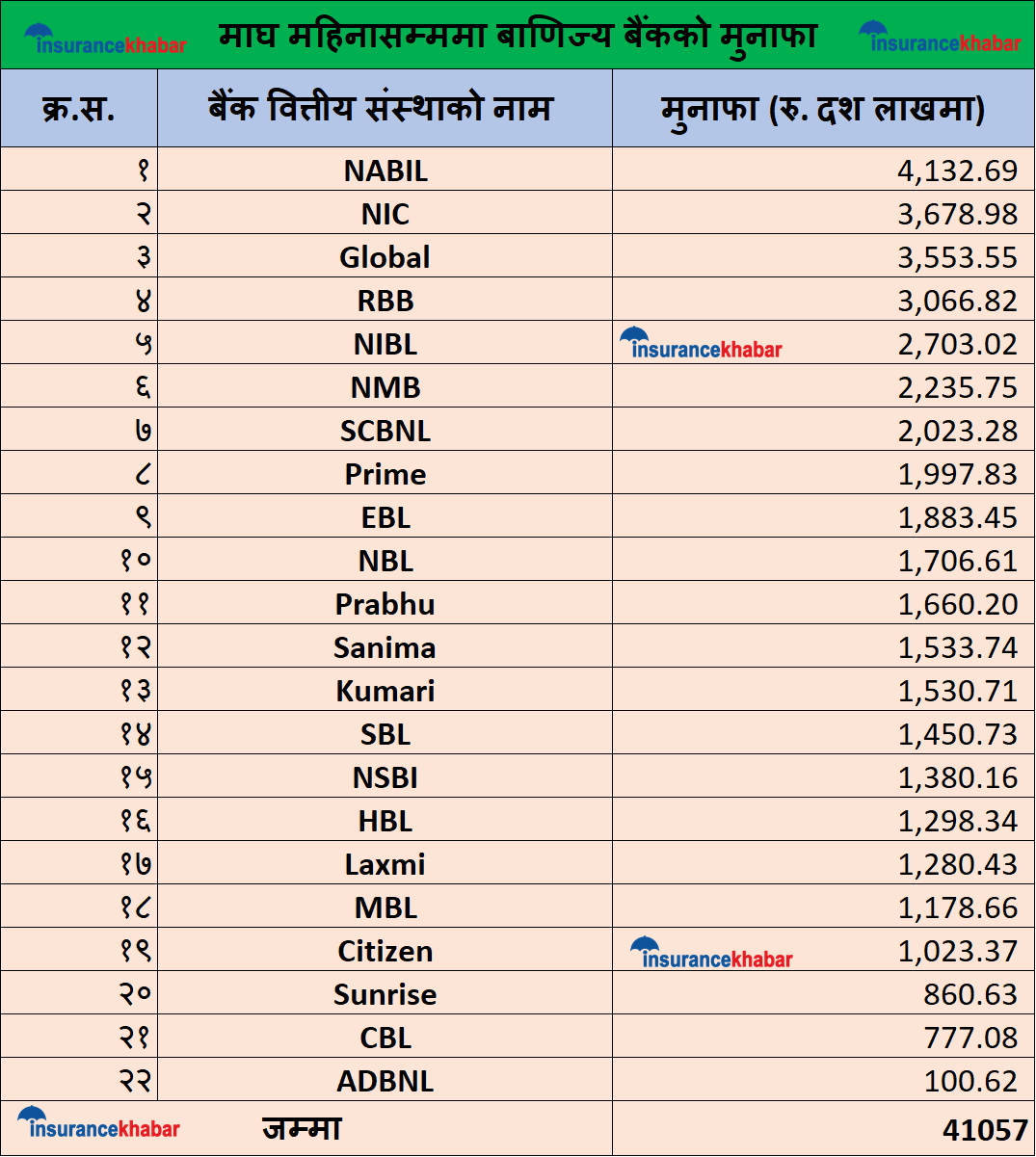 काठमाडौं । चालु आर्थिक वर्षको माघ महिनासम्ममा बाणिज्य बैंक, विकास बैंक र फाइनान्सले ४४ अर्ब ४० करोड रुपैयाँ मुनाफा आर्जन गरेका छन् । जसमा बाणिज्य बैंकहरुको मात्रै मुनाफा ४१ अर्ब ५ करोड रुपैयाँ छ । माघ महिनासम्ममा सर्वाधिक धेरै मुनाफा नविल बैंकको ४ अर्ब १३ करोड रुपैयाँ रहेको छ । नेपाल बंगलादेश बैंकलाई प्राप्ति सँगै नविल बैंकको मुनाफामा उल्लेख्य सुधार देखिएको छ ।