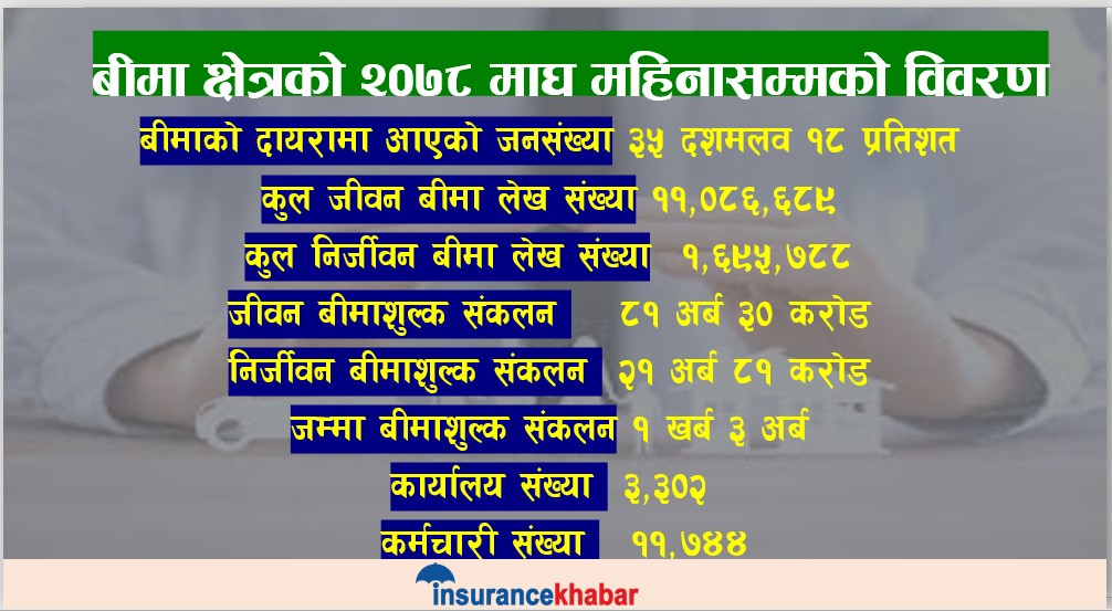 जीवन बीमा तर्फ माघ मसान्तसम्म १ करोड १० लाख बीमा लेख संख्या छ भने निर्जीवन तर्फ १६ लाख ९५ हजार बीमा लेख संख्या छ । जीवन बीमातर्फ बीमा लेख संख्या अघिल्लो माघ मसान्तको तुलनामा ३८ दशमवल ७६ प्रतिशतले वृद्धि भएको छ भने निर्जीवन तर्फ बीमा लेख संख्यामा समिक्षा अवधिमा ४ दशमवल ४२ प्रतिशतको गिरावट आएको छ।
