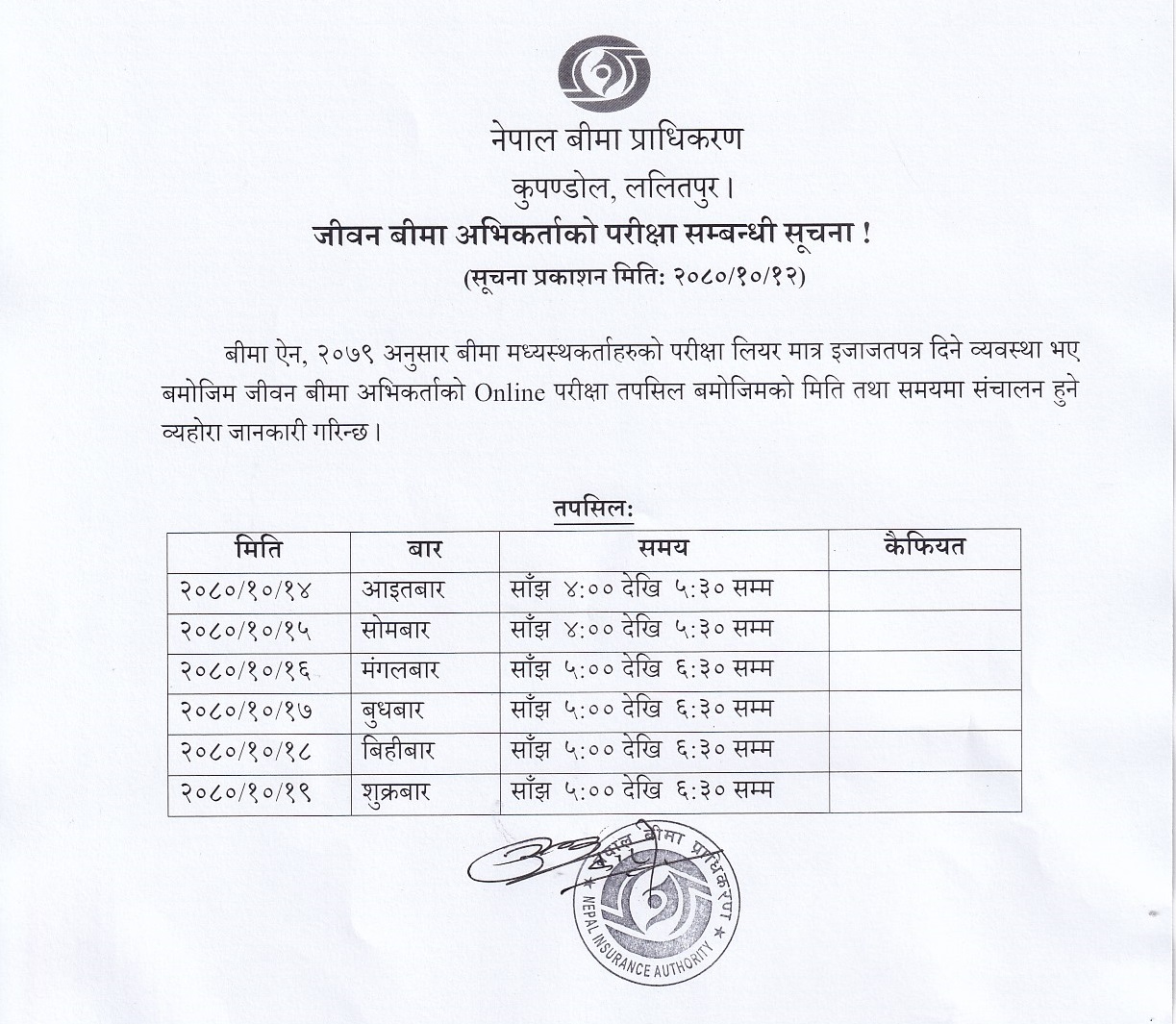 काठमाडौं । नेपाल बीमा प्राधिकरणले माघ १४ गतेबाट जीवन बीमा अभिकर्ताको अनलाइन परीक्षा संचालन गर्ने भएको छ । प्राधिकरणले बीमा ऐन २०७९ अनुसार जीवन बीमा मध्यस्थकर्ताहरुको परीक्षा लिएरमात्रै इजाजत दिने व्यवस्था भएबमोजिम जीवन बीमा अभिकर्ताको माघ १४ गतेबाट हुने अनलाइन परीक्षाको मिति सार्वजनिक गरेको हो ।