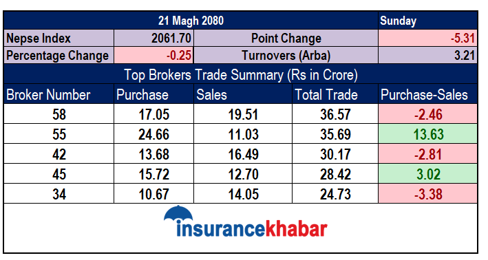 आज ३ अर्ब २१ करोड रुपैयाँबराबरको कारोबार भएको दिन ब्रोकर नम्बर ५८ बाट सर्वाधिक रकमको कारोबार भएको छ। ब्रोकर नम्बर ५८ बाट ३६ करोड ५७ लाख रुपैयाँको कारोबार भएको छ। जसमा १७ करोड ५ लाख रुपैयाँको खरिद छ भने १९ करोड ५१ लाख रुपैयाँको बिक्री छ।