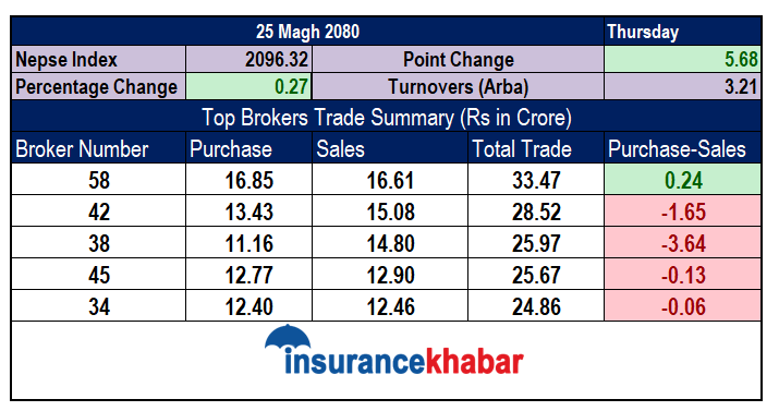 ब्रोकर नम्बर ५८ बाट ३३ करोड ४७ लाखको कारोबार भएको छ जसमा १६ करोड ८५ लाखको खरीद छ भने १६ करोड ६१ लाखको विक्री छ ।