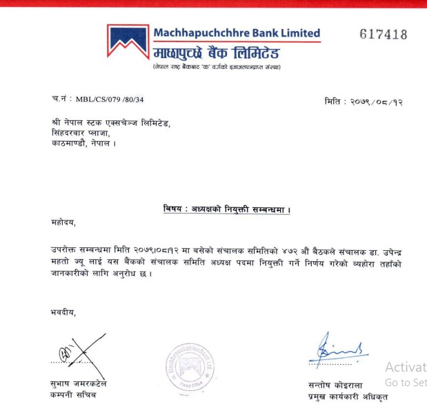 काठमाडौं । माछापुच्छ्रे बैंकको अध्यक्षमा डा. उपेन्द्र महतो चयन भएका छन्। बैंकको सोमबार बसेको संचालक समितिको ४७ औं बैंठकले डा. उपेन्द्र महतोलाई संचालक समितिको अध्यक्षमा नियुक्त गरेको हो ।