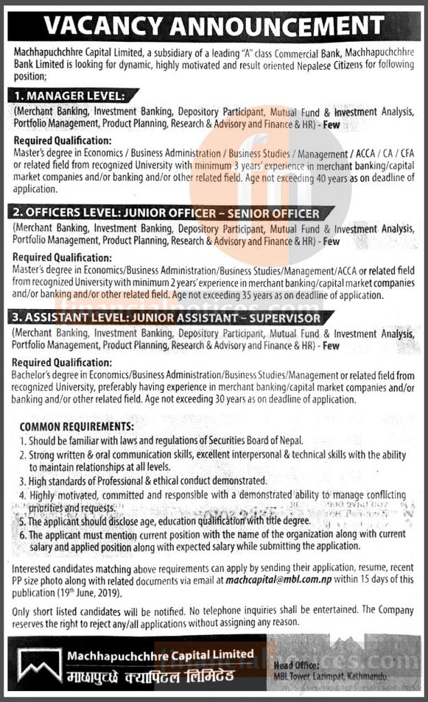 माछापुच्छ्रे क्यापिटल लिमिटेडले विभिन्न पदका लागि कर्मचारीको माग गरेको छ । क्यापिटलले म्यानेजर लेभलका लागि केही, अफिसर लेभल(जूनियर अफिसर र सिनियर अफिसर)का लागि केही र असिस्टेन्ट लेभल(जूनियर असिस्टेन्ट र सूपरभाईजर)का लागि केही संख्यामा कर्मचारीको माग गरेको हो ।