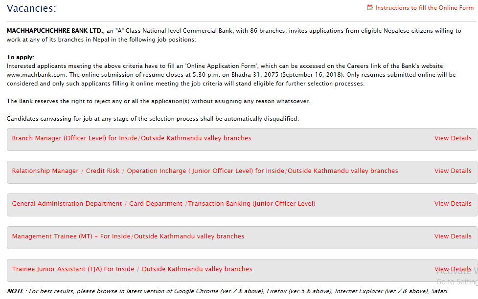 काठमाडौं: माछापुच्छ्रे बैंकले नयाँ शाखाका लागि उपत्यकाभित्र तथा बाहिर गरि १०१ जना कर्मचारी माग गरेको छ। बैंकले अनुभव भएका र नभएका व्यक्तिबाट आबेदन माग गरेको छ। बैंकले ब्रान्च म्यानेजर देखि एसिस्टेन्ट लेभलका कर्मचारी माग गरेको छ । सहायक स्तरको अधिकृत तहमा ७ जना रिलेसनसीप म्यानेजर माग गरिएको छ। यसका लागि स्नातकोत्तर गरि बाणिज्य बैंकहरुमा कम्तीमा पनि तीन वर्षको कार्यानुभव हुनु पर्नेछ। अधिकतम ४० वर्ष ननाघेका नेपाली नागरिकले आवेदन दिन सक्ने बैंकले जनाएको छ।