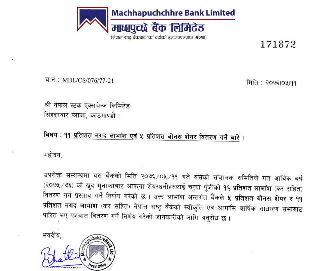प्रस्तावित लाभांश राष्ट्र बैंक र आगामी वार्षिक साधारण सभाबाट अनुमोदन भएपछि वितरण हुनेछ ।