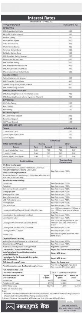 काठमाडौं । माछापुच्छ्रे बैंकले जेठ १ गतेदेखि लागु हुने गरि नयाँ व्याजदर सार्वजनिक गरेको छ ।बैंकले विभिन्न खातामा जेठ १ गतेबाट लागु हुने गरी नयाँ व्याजदर सार्वजनिक गरेको हो ।