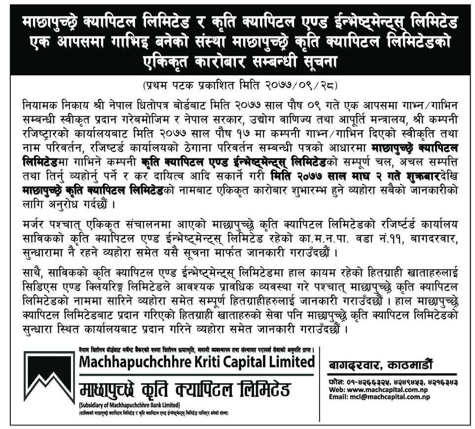 काठमाडौँ । माछापुच्छ्रे क्यापिटल लिमिटेड र कृति क्यापिटल लिमिटेडले आज देखि एकीकृत कारोबार शुरु गरेका छन् ।