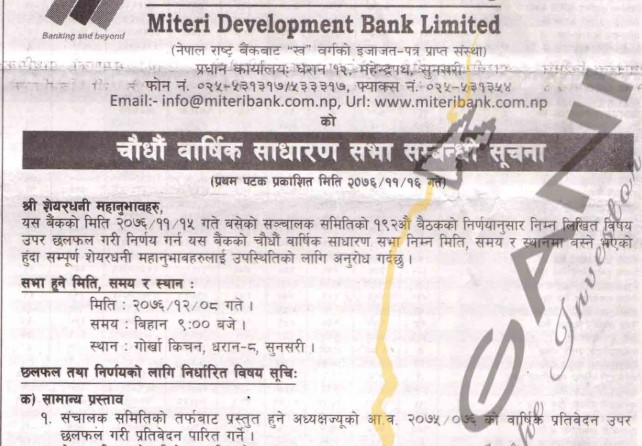 काठमाडौं । मितेरी डेभलपमेन्ट बैंकले चैत ८ गते साधारण सभा गर्ने भएको छ । बैंकको चौधौँ वार्षिक साधारण सभा गोर्खा किचन, धरानमा बिहान ९ बजेदेखि शुरु हुने जनाइएको छ ।