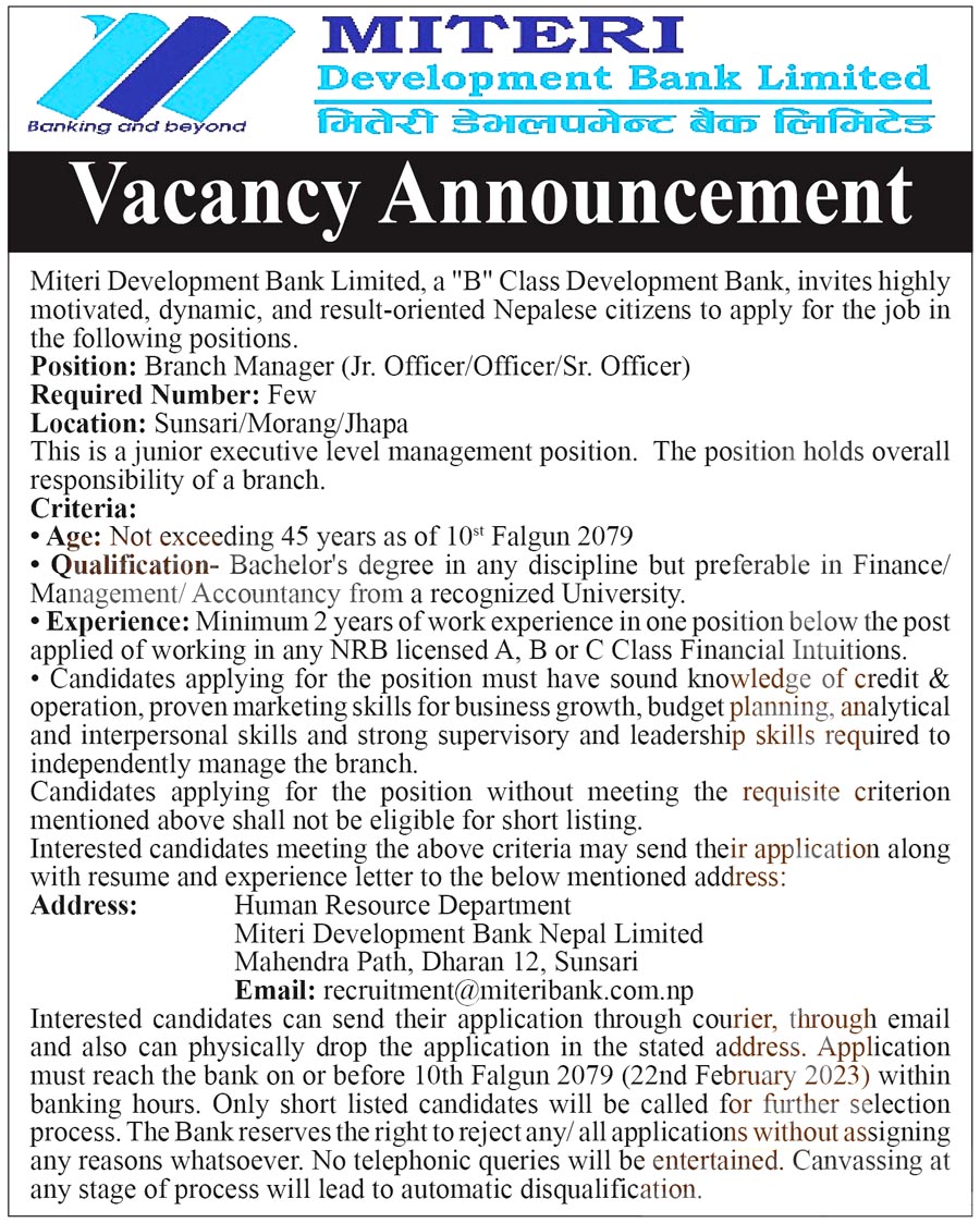 काठमाडौं । मितेरी डेभलपमेन्ट बैंक लिमिटेडले कर्मचारीको माग गरेको छ । बैंकले केही संख्यामा ब्रान्च म्यानेजरको लागि कर्मचारी माग गरेको हो । उक्त पदका लागि बैंकले म्यानेजेन्ट संकाय अन्तर्गत स्नातक तह उत्तीर्ण गरेको हुनुपर्ने जनाएको छ । ईच्छुक तथा योग्यता पुगेका इच्छुक ब्यक्तिले फागुन १० गतेभित्र बैंकको इमेल मार्फत दरखास्त दिन सक्नेछन् ।