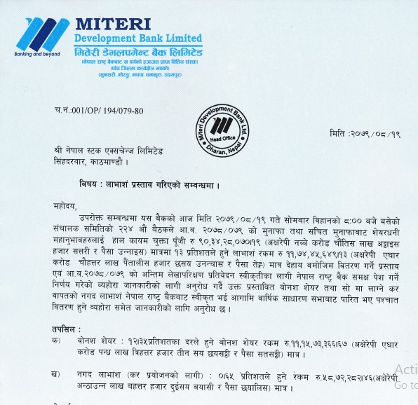 बैंकको उक्त प्रस्तावित लाभांश नेपाल राष्ट्र बैंकबाट स्वीकृत भई आगामी वार्षिक साधारण सभाले पारित गरेपश्चात लगानीकर्ताले पाउनेछन् ।