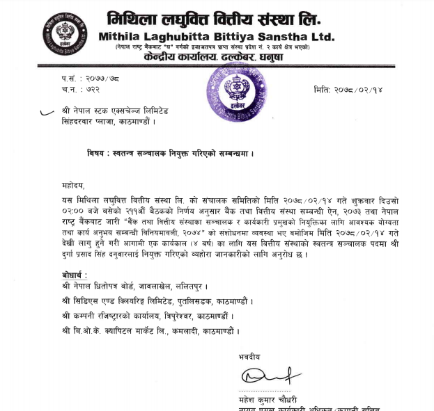 मिथिला लघुवित्तको स्वतन्त्र सञ्चालकमा दनुवार नियुक्त