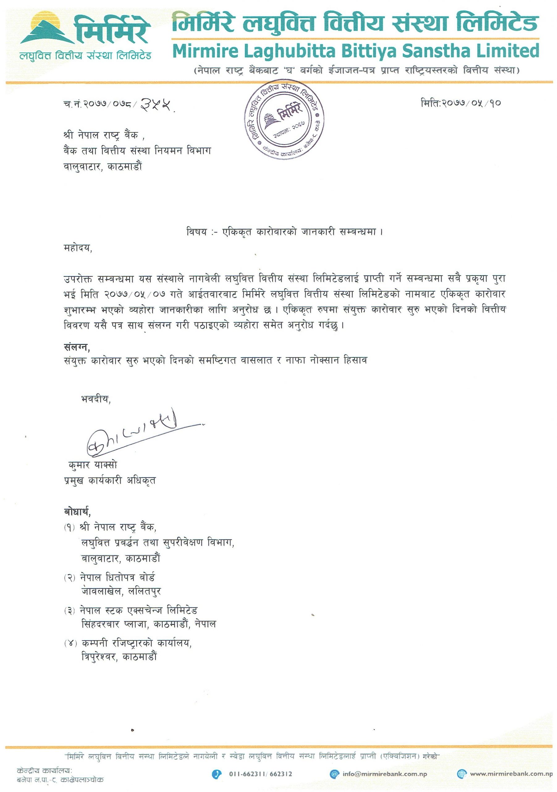 काठमाडौँ । मिर्मिरे लघुवित्त वित्तिय संस्था लिमिटेड र नागबेली लघुवित्त वित्तिय संस्था लिमिटेडविच भदौ ७ गतेदेखि एकीकृत कारोबार शुरु भएको छ । अब देखी दुबैको संयुक्त कारोबार मिर्मिरे लघुवित्त वित्तिय संस्था लिमिटेड नामबाट भएको छ ।