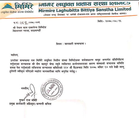 काठमाडौं । मिर्मिरे लघुवित्त वित्तीय संस्थाका सञ्चालक दीप बहादुर श्रेष्ठले राजीनामा दिएका छन् । उनले दिएको राजिनामा गत मंसिर २४ गतेदेखि लागू हुने गरी स्वीकृत गरेको कम्पनीले नेजनाएको छ । उनले व्यक्तिगत कार्यव्यवस्थताको कारण देखाई उक्त पदबाट राजिनामा दिएका हुन् ।