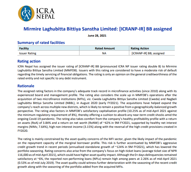 काठमाडौं । मिर्मिरे लघुवित्त वित्तीय संस्था लिमिटेडले निष्काशन गर्न लागेको एफपीओलाई इक्रा नेपालले रेटिङ प्रदान गरेको छ । कम्पनीले निष्काशन गर्न लागेको एफपीओलाई इक्रा नेपालले इक्रा एनपी आइआर डबल बी रेटिङ प्रदान गरेको छ । यस रेटिङले कम्पनीको आधारभुत पक्ष मध्य रहेको देखाउँछ ।