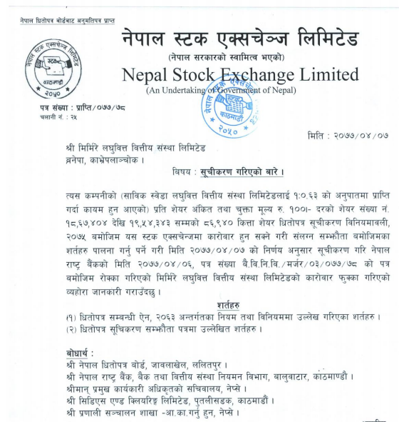 बुधबार स्वेडातर्फको ८६ हजार ९ सय ४० कित्ता शेयर सुचिकृत भएको छ । मिर्मिरेले स्वेडालाई १ः०.६३ अनुपातमा गाभेको हो । मिर्मिरेको कुल सुचिकृत शेयर संख्या १९ लाख ५४ हजार ३ सय ४३ कित्ता भएको छ ।