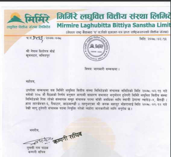 काठमाडौं । मिर्मिरे लघुवित्त वित्तीय संस्थाको संस्थापक समूहको सञ्चालक पदमा बाँकी अवधिका लागि जनक बहादुर बोहरा नियुक्त भएका छन् । रिक्त रहेको संस्थापक समूहको सञ्चालक पदमा बोहरालाई जियुक्त गरिएको जनाएको छ ।