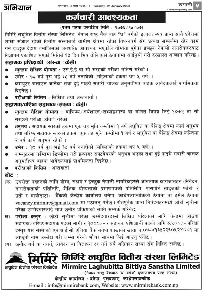 संस्थाले विभिन्न शाखा कार्यालयका लागि उल्लेखित कर्मचारीको माग गरिएको हो । ईच्छुक तथा योग्यता पुगेकाले विज्ञापन प्रकाशित भएको मितिले १५ दिनभित्र आवेदन दिइसक्नुपर्नेछ ।