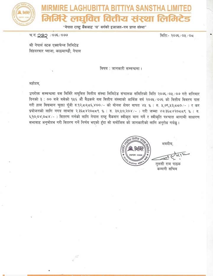 काठमाडौं । मिर्मिरे लघुवित्तले लाभांश घोषणा गरेको छ । कम्पनीको भदौ ७ गते बसेको संचालक समितिको बैठकले आर्थिक बर्ष ७५/७६ को मुनाफाबाट लगानीकर्तालाई लाभांश घोषणा गरेको हो ।